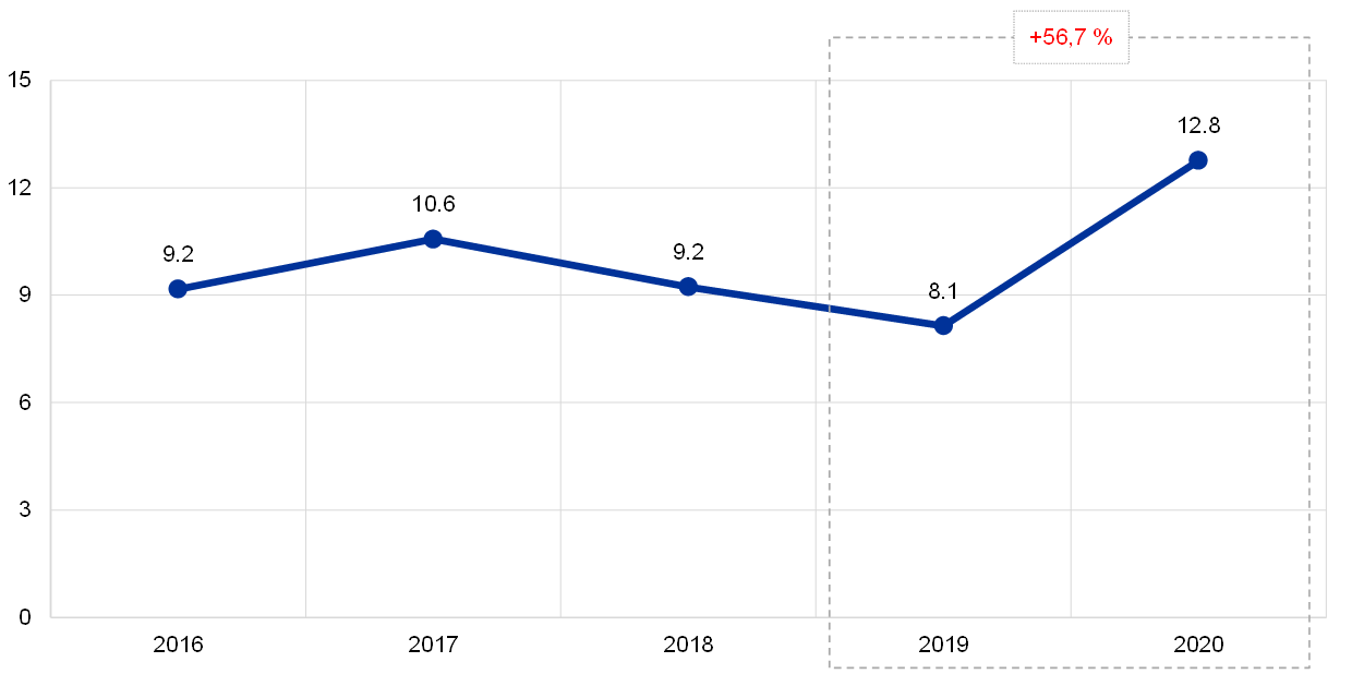 Under 2020 ökade ECB:s tillgångar totalt med 112,2 miljarder euro till 569,3 miljarder euro, främst beroende på dess andel av värdepappersköpen inom det nya PEPP-programmet (stödköpsprogram föranlett av pandemin)[6] och programmet för köp av tillgångar (APP). Dessa köp resulterade i en ökning i ”Värdepapper som innehas i penningpolitiska syften” medan kontantavvecklingen av dessa köp via Target2 ledde till en motsvarande ökning i ”Skulder inom Eurosystemet”. Ökningen i värde för utelöpande eurosedlar bidrog också till denna ökning.