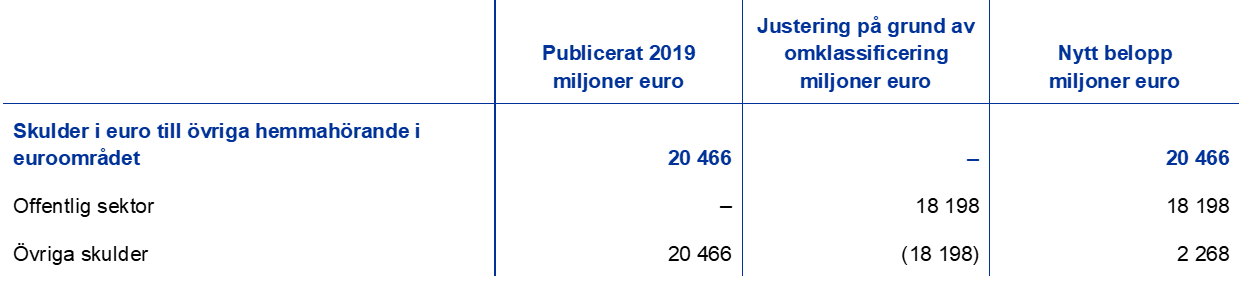 - Dessa innehav består av utländska nettotillgångar denominerade i respektive valuta som är föremål för valutaomvärdering. De ingår i ”Fordringar i utländsk valuta på hemmahörande utanför euroområdet”, ”Fordringar i utländsk valuta på hemmahörande i euroområdet”, ”Upplupna intäkter och förutbetalda kostnader”, ”Upplupna kostnader och förutbetalda intäkter”, och med beaktande av valutaterminer och swapptransaktioner under poster utanför balansräkningen. Prisökningar på finansiella instrument i utländsk valuta som orsakas av omvärderingar ingår inte.
