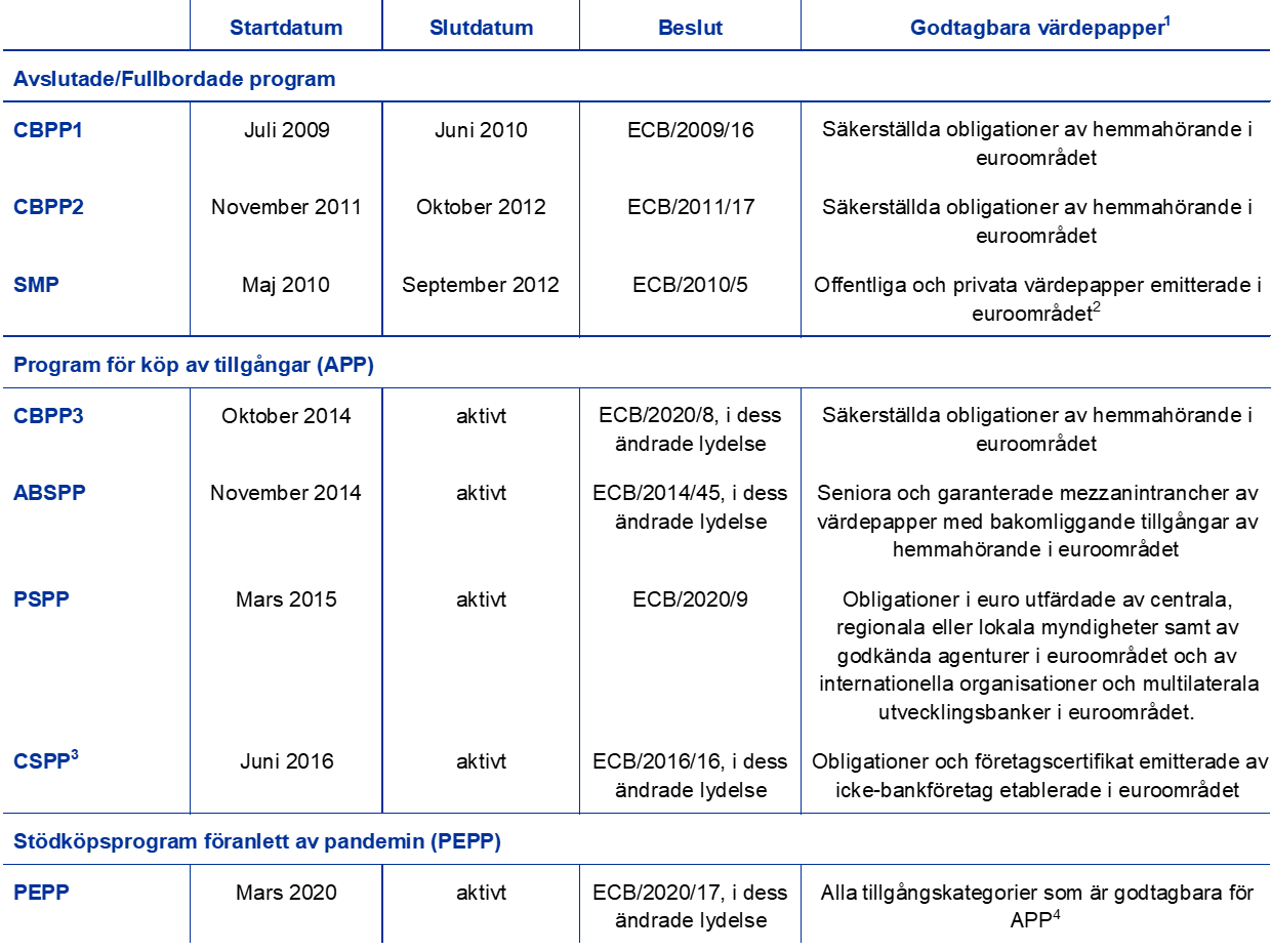- APP består av det tredje programmet för köp av säkerställda obligationer (CBPP3), programmet för köp av värdepapper med bakomliggande tillgångar (ABSPP), programmet för köp av offentliga värdepapper (PSPP) och programmet för köp inom företagssektorn (CSPP). ECB köper inte värdepapper inom ramen för CSPP. Mer information om APP finns på ECB:s webbplats.