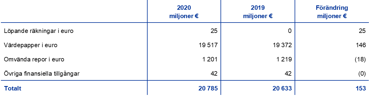 - Dessa innehav omfattar tillgångar i ”Fordringar i utländsk valuta på hemmahörande utanför euroområdet – Banktillgodohavanden och värdepapper, lån och andra tillgångar, och ”Fordringar i utländsk valuta på hemmahörande i euroområdet”.