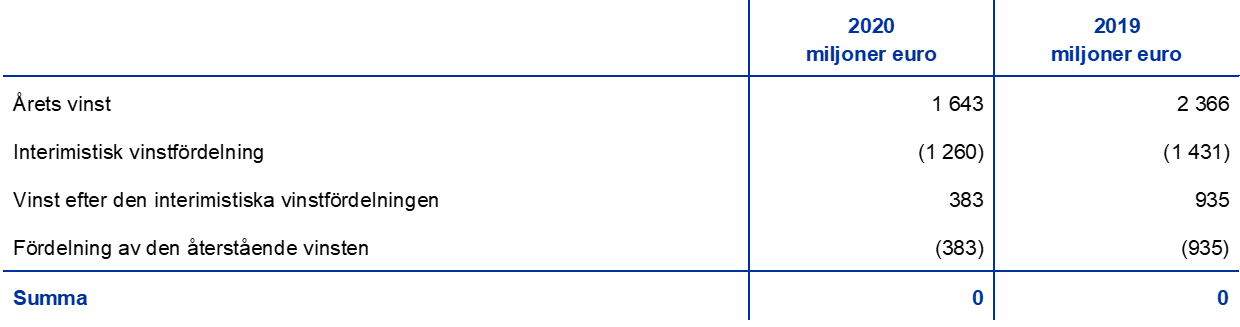 ECB:s nettovinst för 2020 var 1 643 miljoner euro. Efter beslut av ECB-rådet gjordes en interimistisk vinstfördelning på 1 260 miljoner euro som betalades ut till de nationella centralbankerna i euroområdet den 29 januari 2021. ECB-rådet beslutade dessutom att fördela återstoden av vinsten på 383 miljoner euro till de nationella centralbankerna i euroområdet.