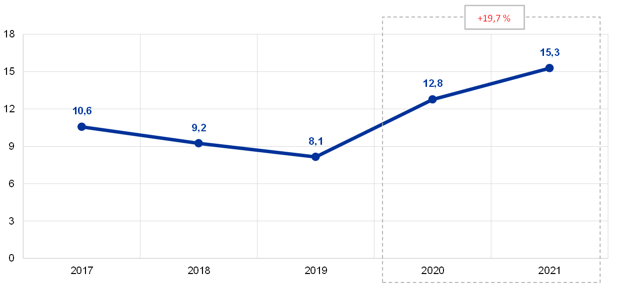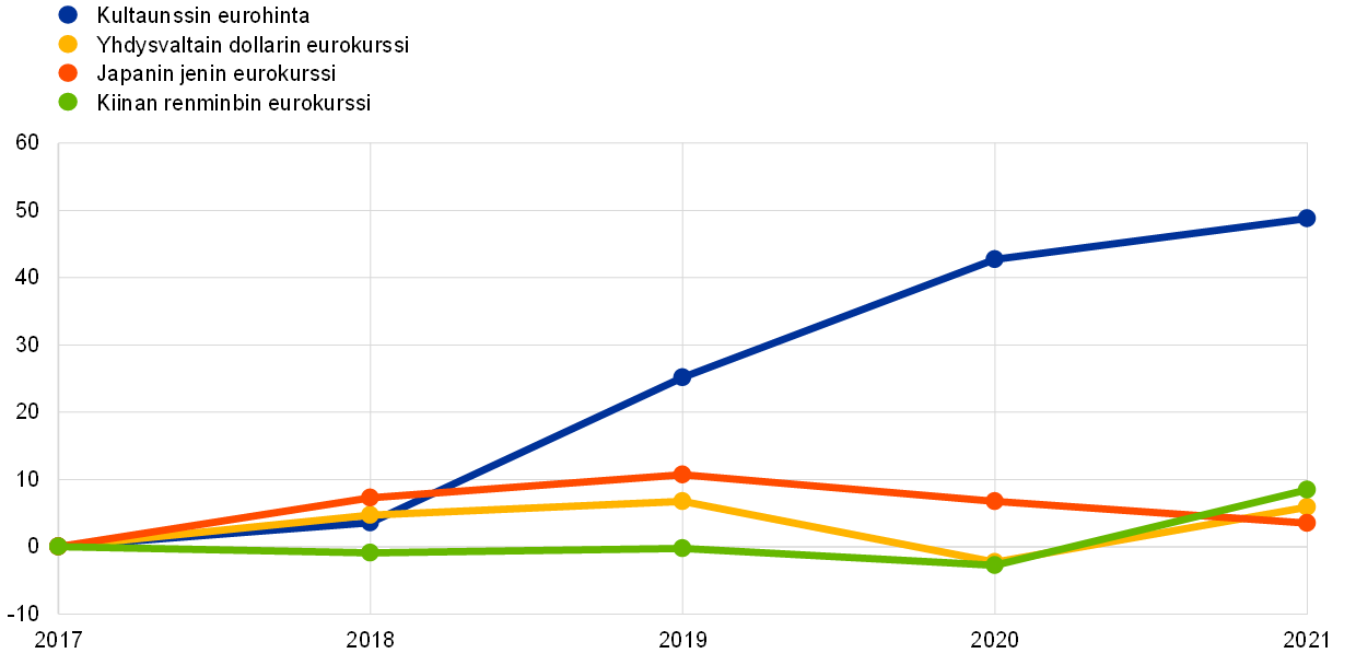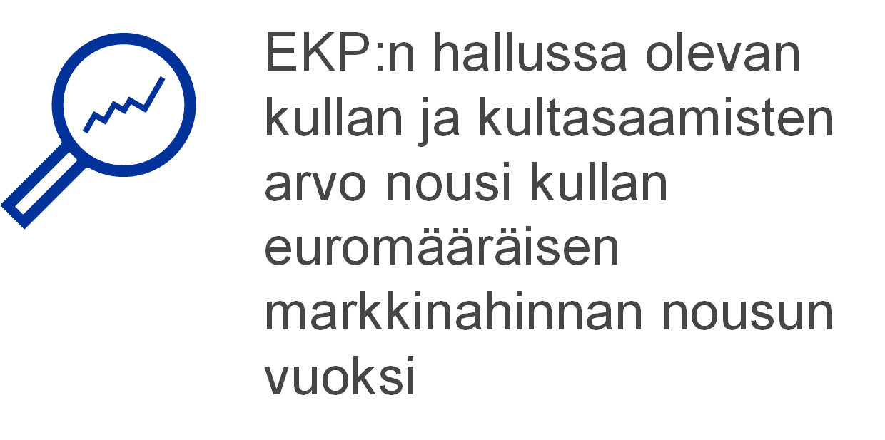 EKP:n kultavarannon unssimäärä pysyi ennallaan vuonna 2021, mutta kullan ja kultasaamisten euromääräinen arvo nousi 1,1 miljardia euroa eli 26,1 miljardiin euroon kullan euromääräisen markkinahinnan nousun vuoksi (ks. kuvio 4). Kullan arvonmuutostilien saldo suureni saman verran (ks. osa 1.3.2 ”Taloudelliset resurssit”).