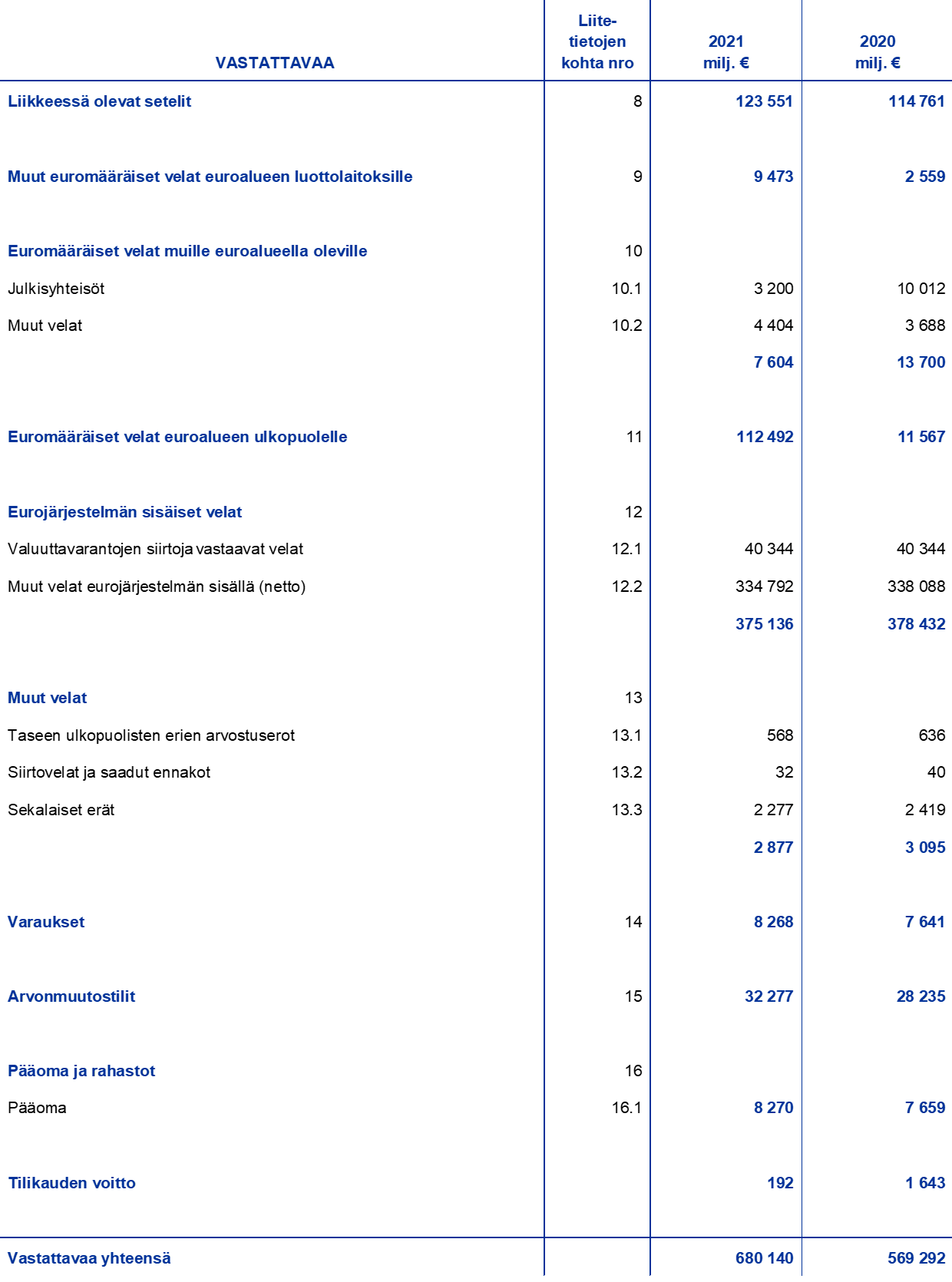 Vuonna 2021 EKP:n taseen loppusumma kasvoi 110,8 miljardia euroa 680,1 miljardiin euroon. Kasvun taustalla oli lähinnä EKP:n osuus PEPP- ja APP-ohjelmissa. Ostot näkyivät kasvuna erässä ”Rahapolitiikan harjoittamista varten pidettävät arvopaperit”, ja myös erä ”Eurojärjestelmän sisäiset velat” kasvoi vastaavasti, kun ostoihin liittyvät maksut selvitettiin TARGET2-tilien välityksellä. Muihin velkoihin kuuluvat euroalueen ulkopuolisilta TARGET2-asiakkailta saadut käteisvarat kasvoivat eurojärjestelmän sisäisiä velkoja enemmän.
