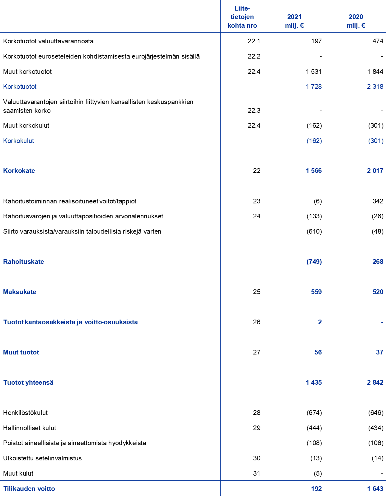 EKP:n voitto tilikaudelta 2021 oli 192 miljoonaa euroa (1 643 miljoonaa euroa vuonna 2020). Tämä 1 452 miljoonan euron ero edellisvuoteen nähden johtui pääasiassa arvopaperien myyntituottojen vähentymisestä, arvostustappioista ja siirrosta varaukseen taloudellisia riskejä varten. Myös korkokate pieneni (ks. kuvio 13).