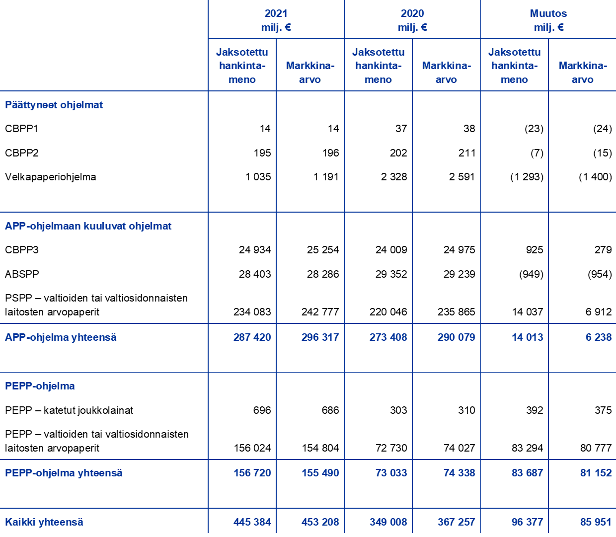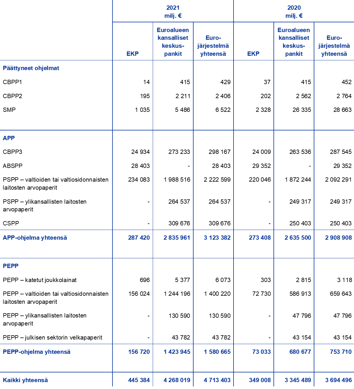 Vuonna 2021 EKP jatkoi netto-ostoja APP- ja PEPP-ohjelmissa. EKP:n neuvoston päätösten mukaisesti arvopaperien erääntyessä takaisin maksettu pääoma sijoitettiin uudelleen. EKP:n salkussa oli vuoden lopussa 445,4 miljardin euron edestä rahapolitiikan harjoittamista varten pidettäviä arvopapereita eli 96,4 miljardia euroa enemmän kuin vuotta aiemmin. Eniten salkkua kasvattivat PEPP-ohjelmassa tehdyt ostot (ks. kuvio 2). SMP-, CBPP1- and CBPP2-ohjelmiin kuuluvien sijoitusten määrä supistui 1,3 miljardia euroa arvopaperien erääntymisen vuoksi.