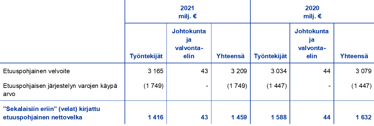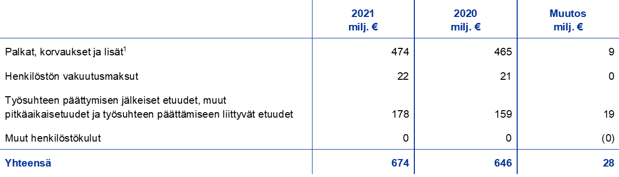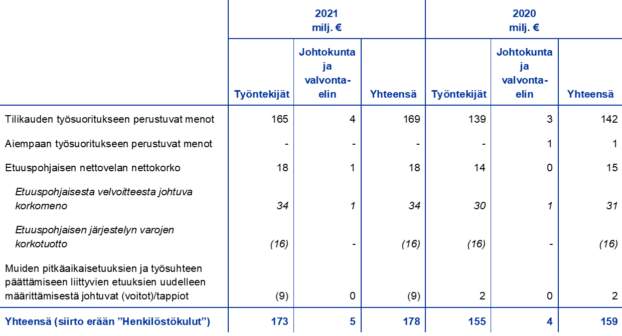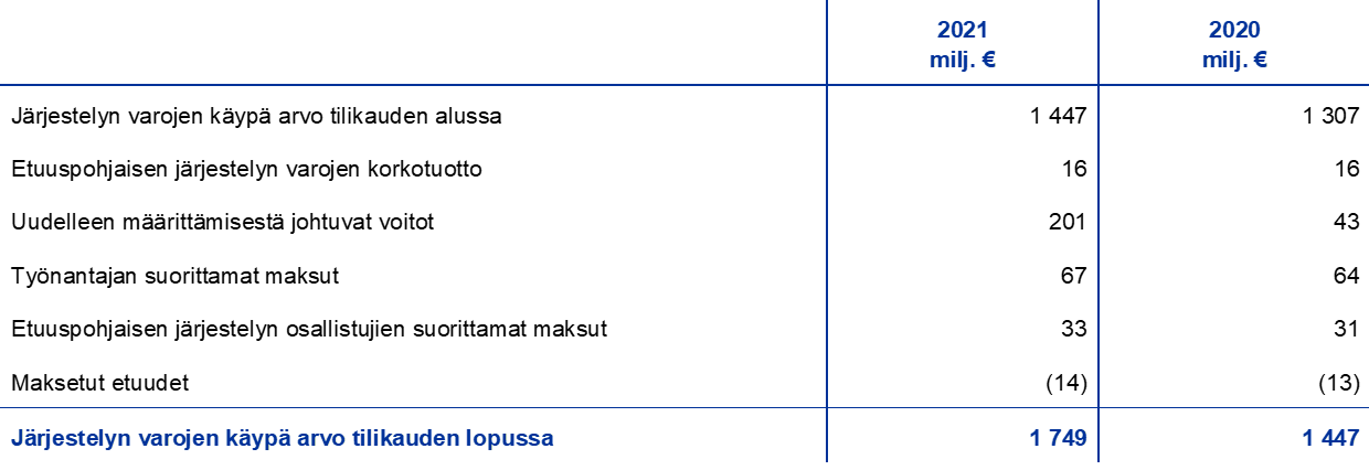 - Eläkejärjestelmän etuuspohjainen osa muodostuu ainoastaan EKP:n ja työntekijöiden maksamista pakollisista eläkemaksuista. Työntekijöiden maksuperusteiseen osaan suorittamat vapaaehtoiset maksut vuodelta 2021 olivat 220 miljoonaa euroa (186 miljoonaa euroa vuonna 2020). Maksut sijoitetaan osaksi järjestelyn varoja, ja niistä syntyy samansuuruinen velvoite.