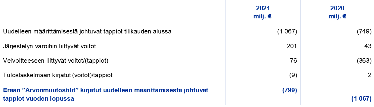 - Tase-erään ”Arvonmuutostilit” sisältyvät myös työsuhteen päättymisen jälkeisten etuuksien uudelleen määrittämisestä johtuvat erät.