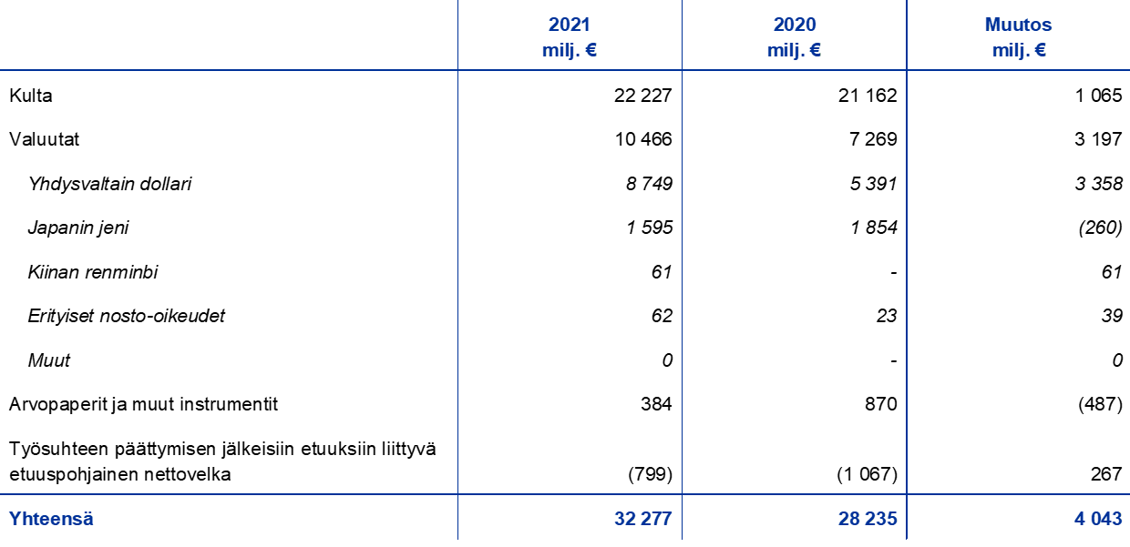 EKP:n valuuttavaranto koostui edelleen valtaosin Yhdysvaltain dollareista, joiden osuus koko varannosta oli vuoden 2021 lopussa noin 77 %.