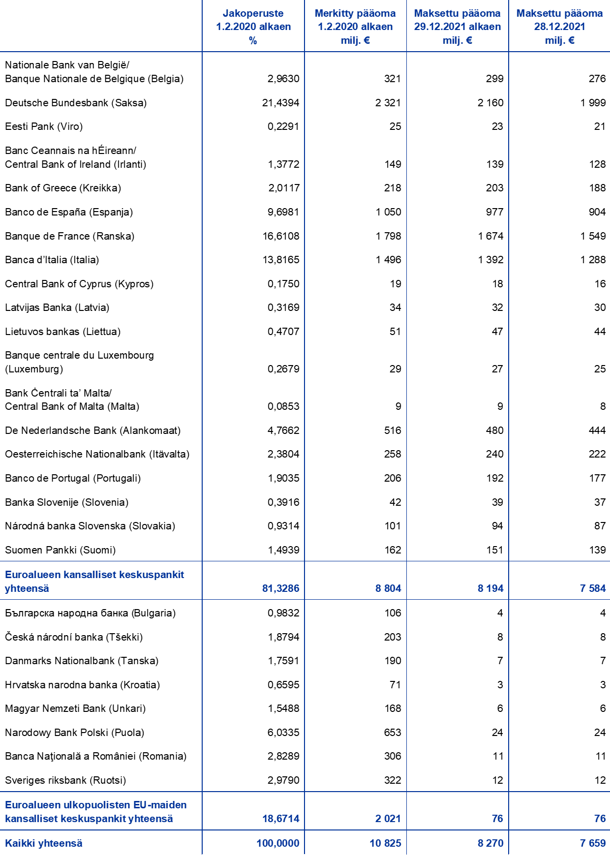 Englannin pankin lähdettyä EKPJ:stä vuonna 2020 muiden kansallisten keskuspankkien osuudet EKP:n merkitystä pääomasta kasvoivat. EKP:n neuvosto päätti, että ne kattaisivat Englannin pankin aiemmin maksaman osuuden (58 miljoonaa euroa) ja että euroalueen kansalliset keskuspankit maksaisivat merkitsemänsä lisäpääoman kokonaisuudessaan kahdessa erässä vuosina 2021 ja 2022. Ensimmäisen erän myötä EKP:n maksettu pääoma kasvoi 0,6 miljardia euroa vuonna 2021 ja oli yhteensä 8,3 miljardia euroa. Vuonna 2022 se kasvaa vielä toiset 0,6 miljardia euroa ja on sen jälkeen 8,9 miljardia euroa.[14]