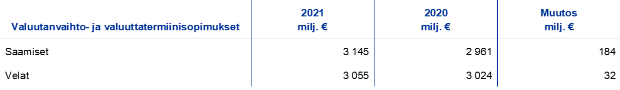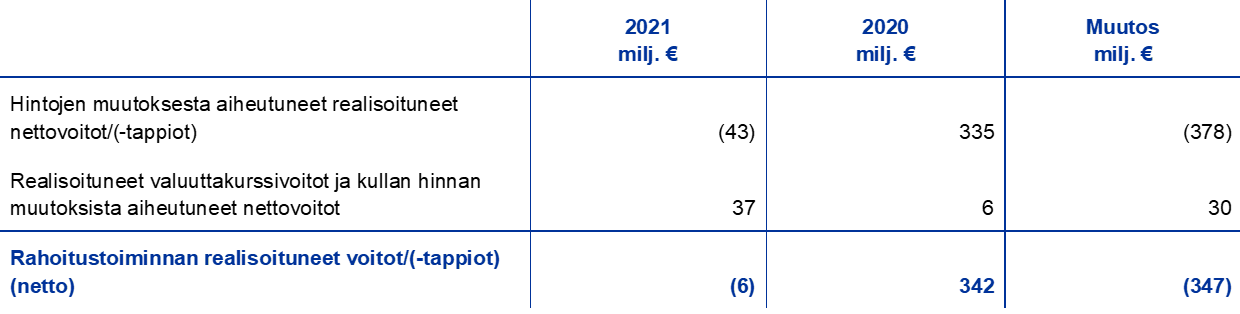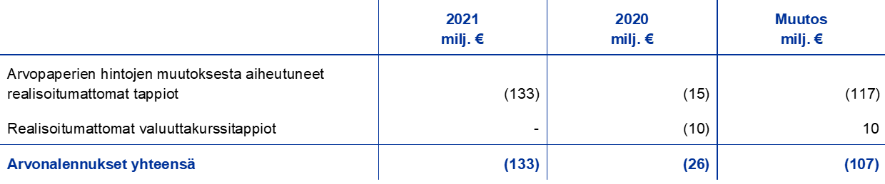 Huom. Arvonmuutostileihin sisältyvät kaikki kullasta, valuutoista ja arvopapereista kirjatut arvostusvoitot mutta eivät työsuhteen päättymisen jälkeisten etuuksien uudelleen määrittämisestä johtuvat erät.