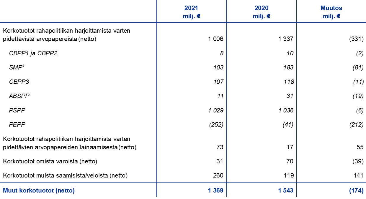 EKP:n korkokate oli 1 566 miljoonaa euroa, eli se pieneni 451 miljoonaa euroa (ks. kuvio 14). Pienenemisen taustalla oli pääasiassa rahapoliittisista syistä hallussa pidetyistä arvopapereista ja valuuttavarannosta kertyneiden korkotuottojen supistuminen. Muut korkotuotot (netto) kasvoivat jonkin verran.