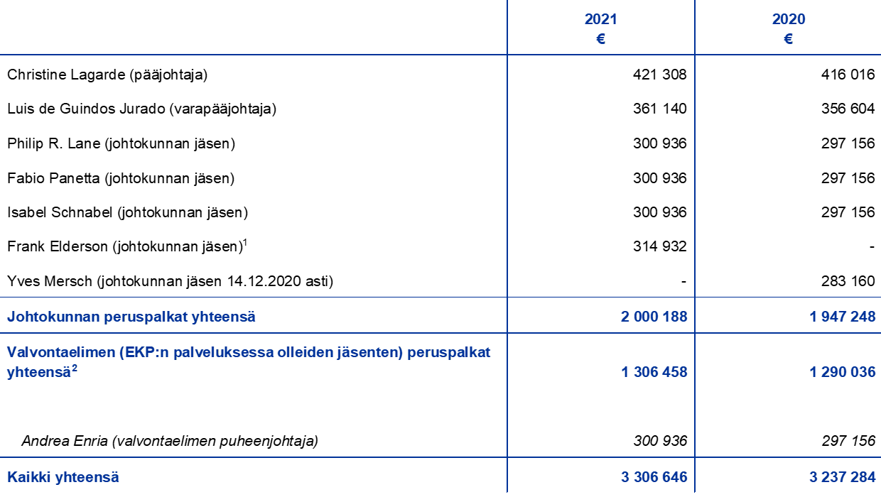 - Johtokunnan nykyisten jäsenten ja EKP:n palveluksessa olevien valvontaelimen nykyisten jäsenten eläkejärjestelyihin liittyvä nettomäärä, joka kirjataan tuloslaskelmaan kuluksi, on esitetty tarkemmin liitetietojen kohdassa 13.3 ”Sekalaiset erät”.