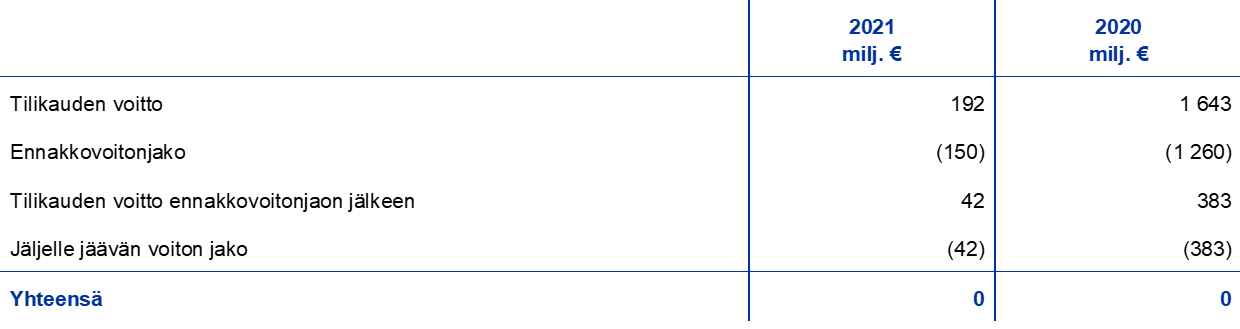 EKP:n saamisista ja veloista tilikauden aikana kertyneitä voittoja voidaan käyttää saman tilikauden aikana syntyneiden mahdollisten tappioiden kattamiseen. Vuonna 2021 EKP:n voitto oli varaukseen tehdyn siirron jälkeen 0,2 miljardia euroa (ks. osa 1.3.3 ”Tuloslaskelma”).