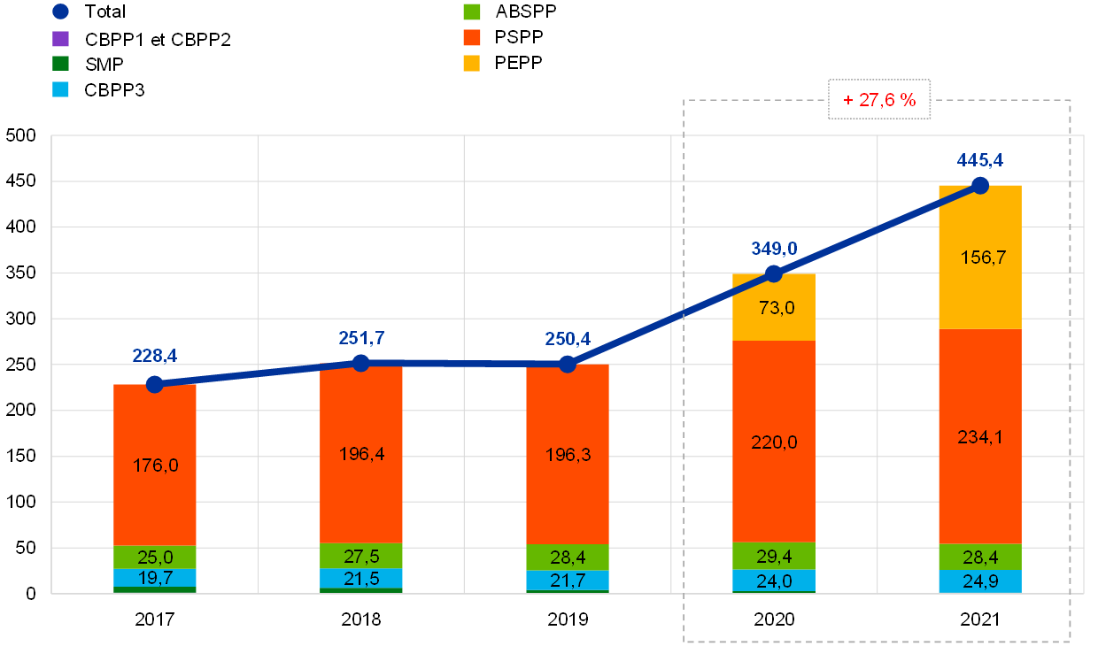 En 2021, la BCE, sur la base des décisions du Conseil des gouverneurs en la matière, a poursuivi ses achats nets dans le cadre de l’APP et du PEPP, y compris le réinvestissement de remboursements au titre du principal des titres arrivant à échéance acquis en vertu de ces programmes. Par conséquent, le portefeuille de titres détenus par la BCE à des fins de politique monétaire s’est accru de 96,4 milliards d’euros, à 445,4 milliards d’euros (graphique 2), cette hausse découlant principalement des achats effectués dans le cadre du PEPP. La baisse de 1,3 milliard d’euros des avoirs au titre du SMP, du CBPP1 et du CBPP2 s’explique par des remboursements.