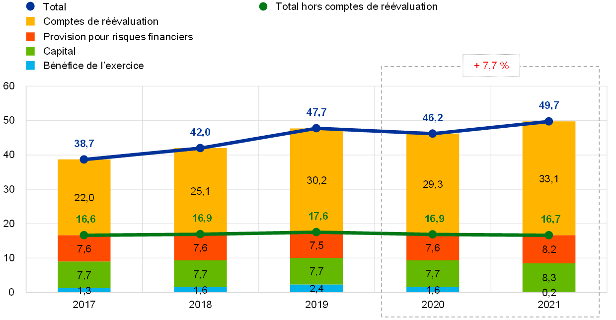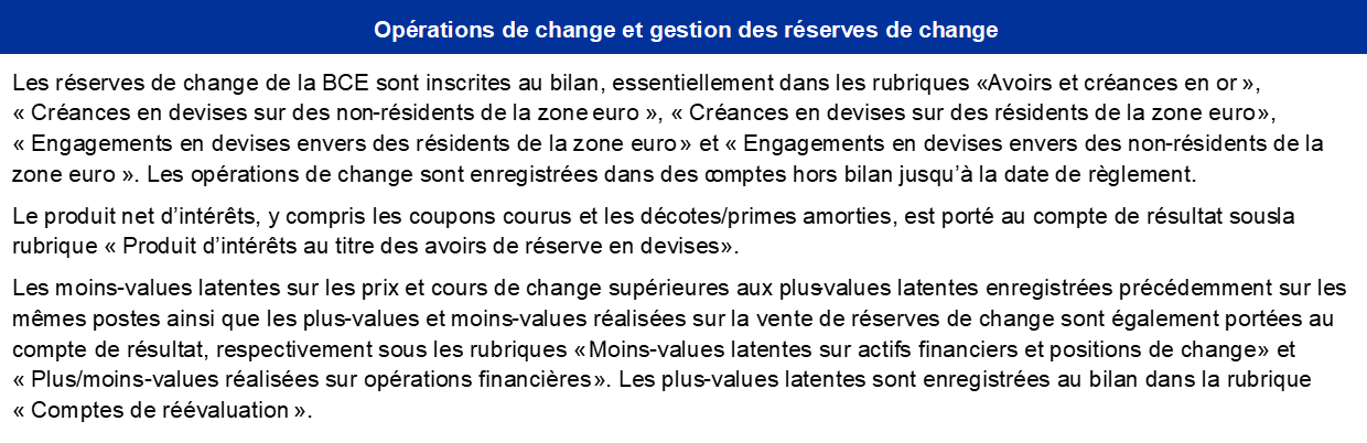 Note : Les « Comptes de réévaluation » comprennent les plus-values de réévaluation totales sur les avoirs en or, en devises et en titres, à l’exclusion du compte de réévaluation relatif aux avantages postérieurs à l’emploi.