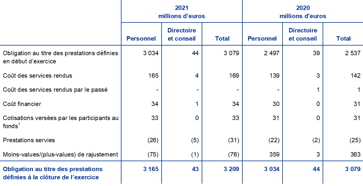 - Le régime à prestations définies n’intègre que les cotisations obligatoires versées par la BCE et les employés. Les versements supplémentaires effectués par les membres du personnel, sur une base volontaire, dans un fonds à cotisations définies se sont élevés en 2021 à 220 millions d’euros (contre 186 millions d’euros en 2020). Ces contributions sont investies dans les actifs du fonds et donnent lieu à une obligation correspondante de valeur égale.