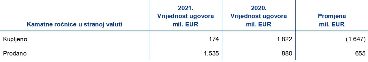 Neto kamatni prihodi od deviznih pričuva smanjili su se za 277 mil. EUR na 197 mil. EUR, uglavnom zbog manjih kamatnih prihoda ostvarenih od vrijednosnih papira nominiranih u američkim dolarima. Zbog nižih prinosa na obveznice nominirane u američkim dolarima tijekom većeg dijela 2020. i 2021. (Grafikon 17.) te prodaje i otkupa prethodno kupljenih obveznica s višim prinosom prosječna kamatna stopa koju je ESB ostvario od portfelja u američkim dolarima u 2021. dodatno se smanjila u odnosu na prethodnu godinu.