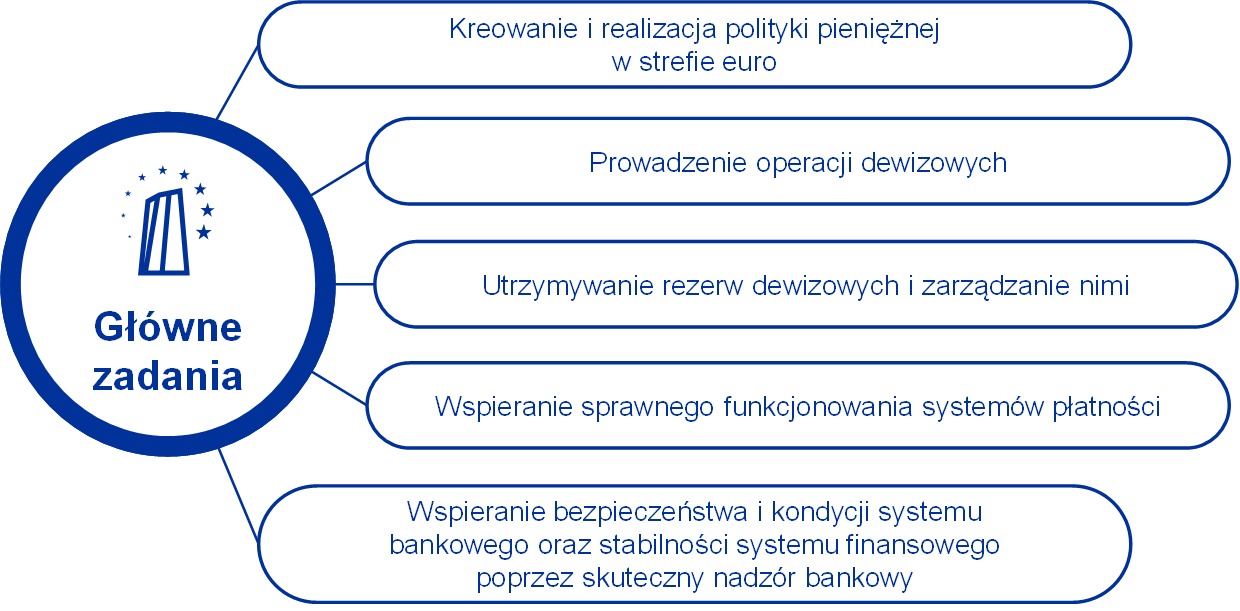 Europejski Bank Centralny wraz z 19 bankami centralnymi państw członkowskich UE ze strefy euro tworzą Eurosystem. Podstawowym celem Eurosystemu jest utrzymanie stabilności cen[3]. Zadania EBC są określone w Traktacie o funkcjonowaniu Unii Europejskiej[4] oraz w Statucie Europejskiego Systemu Banków Centralnych i Europejskiego Banku Centralnego (dalej: Statut ESBC)[5] (rysunek 1). Działania EBC są ukierunkowane na wypełnianie jego mandatu, nie zaś – na osiąganie zysku.