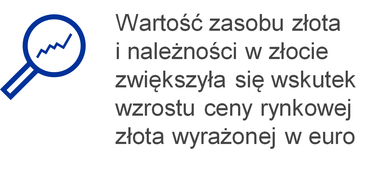 Równowartość w euro zasobu złota i należności w złocie w 2021 zwiększyła się o 1,1 mld EUR, do 26,1 mld EUR (wykres 4), co wynikało ze wzrostu ceny rynkowej tego kruszcu wyrażonej w euro, podczas gdy wielkość zasobu złota wyrażona w uncjach nie uległa zmianie. Ten wzrost doprowadził także do zwiększenia się salda różnic z wyceny o taką samą kwotę (zob. punkt 1.3.2 „Zasoby finansowe”).