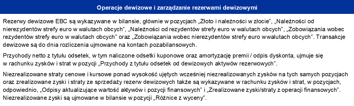 - Do tych zasobów zaliczają się aktywa wykazywane w pozycjach bilansowych „Należności od nierezydentów strefy euro w walutach obcych – środki na rachunkach w bankach, inwestycje w papiery wartościowe, kredyty zagraniczne i inne aktywa zagraniczne” oraz „Należności od rezydentów strefy euro w walutach obcych”.
