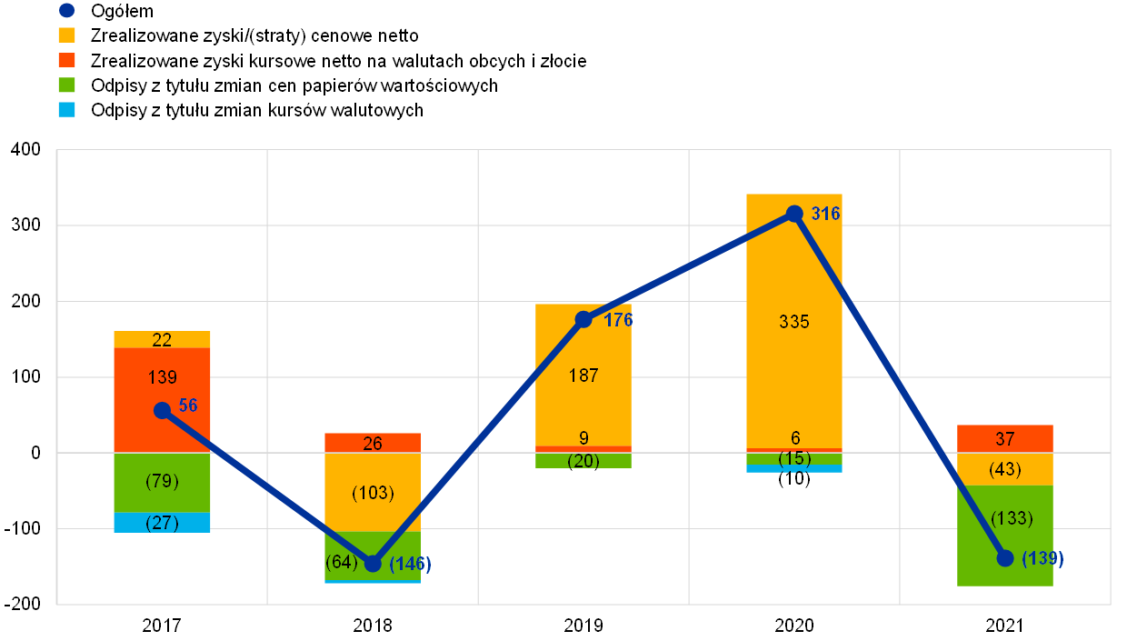 Zysk osiągnięty w danym roku obrotowym z tytułu aktywów i pasywów EBC może zostać wykorzystany do pokrycia potencjalnych strat poniesionych w tym samym roku. W 2021 zysk EBC – po zasileniu rezerwy na ryzyka finansowe – wyniósł 0,2 mld EUR (zob. punkt 1.3.3 „Rachunek zysków i strat”).