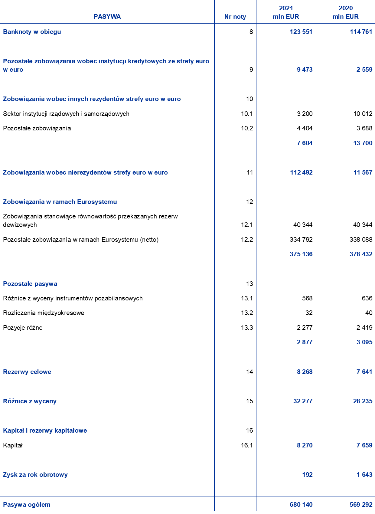 W 2021 suma bilansowa EBC wzrosła o 110,8 mld EUR, do 680,1 mld EUR, głównie z powodu jego udziału w zakupach papierów wartościowych w ramach programów PEPP i APP. Skutkiem tych zakupów był wzrost zasobu papierów wartościowych na potrzeby polityki pieniężnej, podczas gdy rozliczenia gotówkowe tych transakcji poprzez rachunki w systemie TARGET2 doprowadziły do zwiększenia drugostronnych zobowiązań w ramach Eurosystemu. Ten wzrost zobowiązań w ramach Eurosystemu był z nadwyżką skompensowany przez środki pieniężne od klientów EBC w TARGET2 spoza strefy euro, które doprowadziły również do wzrostu pozostałych zobowiązań.