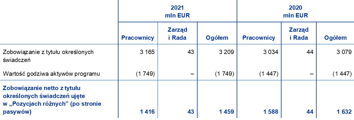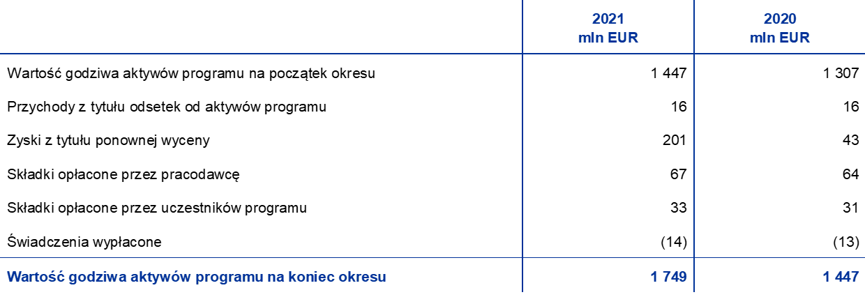 - Filar o określonych świadczeniach odzwierciedla jedynie obowiązkowe składki odprowadzane przez EBC i pracowników. Dobrowolne składki odprowadzane przez pracowników w ramach filaru o określonej składce w 2021 wyniosły 220 mln EUR (2020: 186 mln EUR). Te składki są inwestowane w aktywa programu i rodzą odpowiednie zobowiązanie tej samej wysokości.