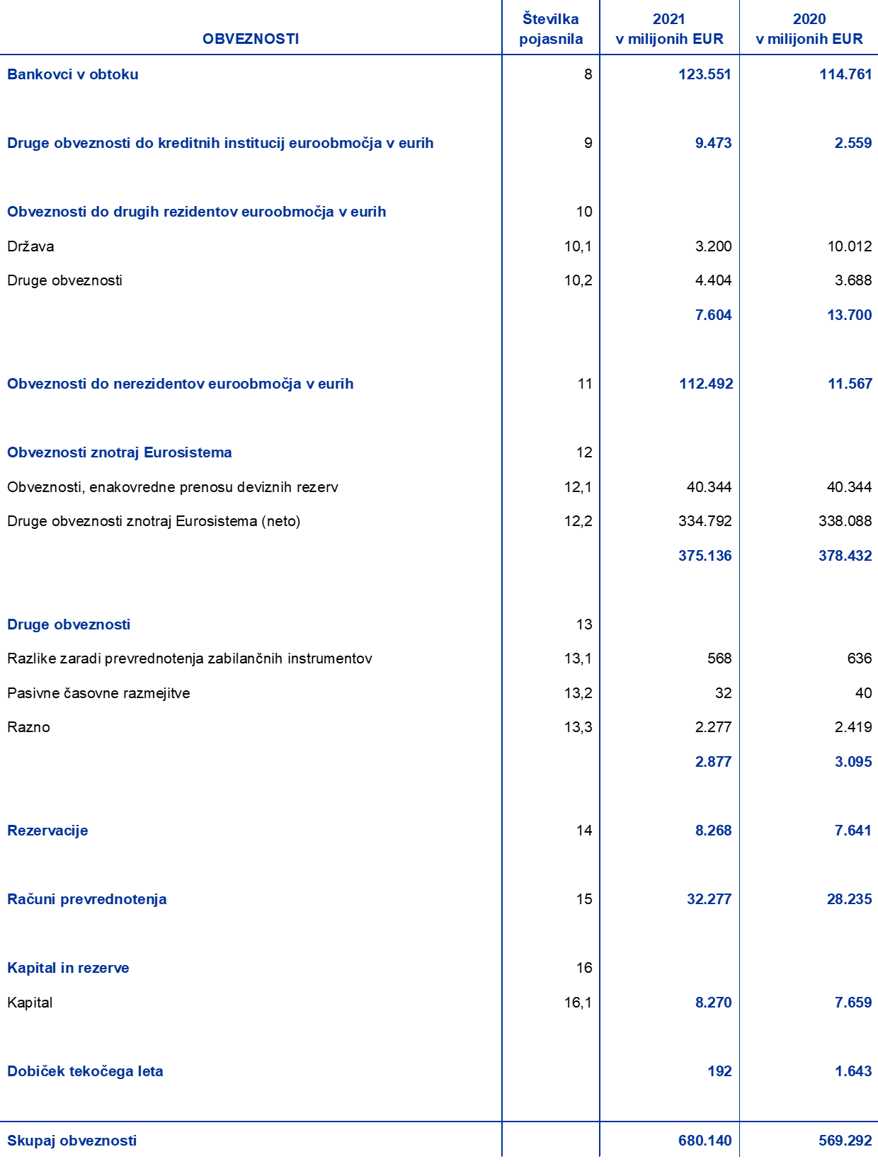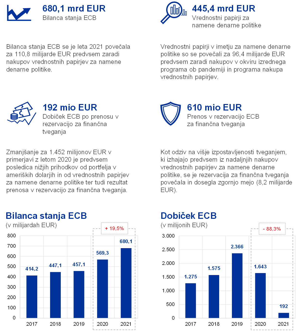 V letu 2021 se je bilanca stanja ECB povečala za 110,8 milijarde EUR na 680,1 milijarde EUR, in sicer predvsem zaradi deleža ECB od vrednostnih papirjev, kupljenih v okviru izrednega programa ob pandemiji in programa nakupa vrednostnih papirjev. Ti nakupi so povzročili povečanje vrednostnih papirjev v imetju za namene denarne politike, medtem ko je denarna poravnava teh nakupov prek sistema TARGET2 privedla do enakovrednega povečanja obveznosti znotraj Eurosistema. Povečanje obveznosti znotraj Eurosistema so več kot odtehtala denarna sredstva, prejeta od strank ECB zunaj euroobmočja v sistemu TARGET2, kar je privedlo tudi do povečanja drugih obveznosti.