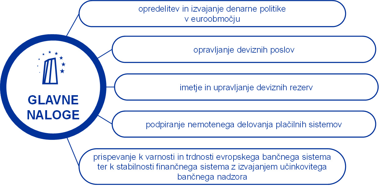 ECB je del Eurosistema, ki poleg ECB obsega še 19 nacionalnih centralnih bank držav članic Evropske unije, katerih valuta je euro. Poglavitni cilj Eurosistema je ohranjati stabilnost cen.[3] ECB svoje naloge opravlja tako, kot je opisano v Pogodbi o delovanju Evropske unije[4] ter v Statutu Evropskega sistema centralnih bank in Evropske centralne banke (Statut ESCB)[5] (slika 1). ECB svoje dejavnosti izvaja z namenom izpolnjevanja svojega mandata in ne z namenom ustvarjanja dobička.