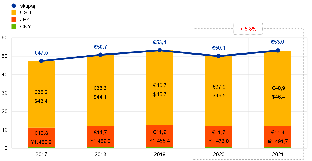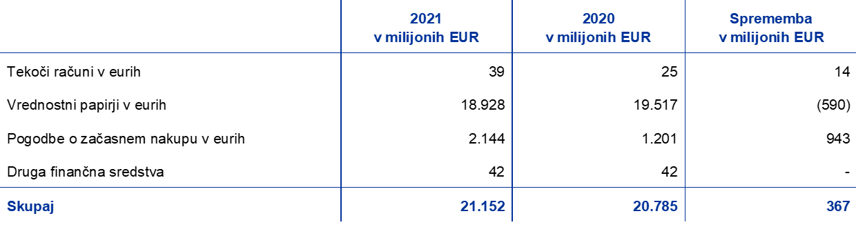 Leta 2021 se je skupna eurska protivrednost deviznih rezerv ECB, ki obsegajo zlato, posebne pravice črpanja, ameriške dolarje, japonske jene in kitajske renminbije, povečala za 4,5 milijarde EUR na 80,3 milijarde EUR.