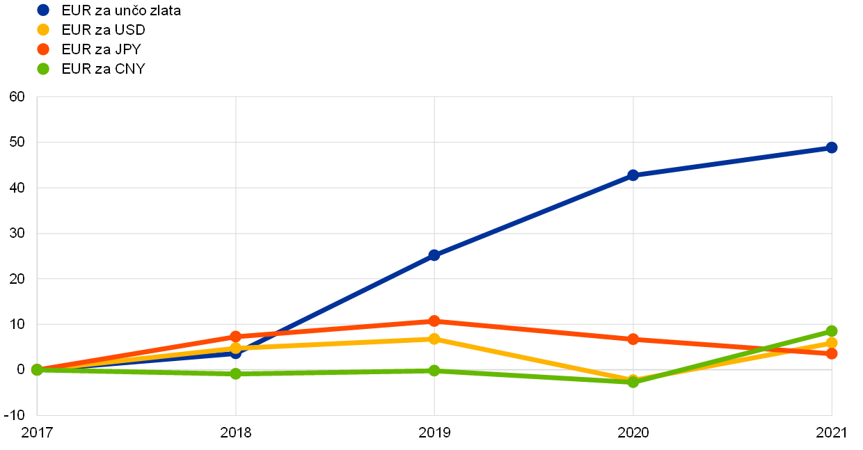 Eurska protivrednost zlata in terjatev v zlatu v imetju ECB se je leta 2021 povečala za 1,1 milijarde EUR na 26,1 milijarde EUR (graf 4), in sicer zaradi zvišanja tržne cene zlata, izražene v eurih, medtem ko je velikost teh imetij v unčah ostala nespremenjena. To povečanje je privedlo tudi do enakovrednega zvišanja vrednosti računov prevrednotenja zlata (glej razdelek 1.3.2 »Finančni viri«).