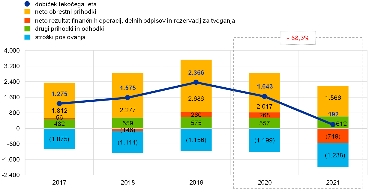 Leta 2021 je dobiček ECB znašal 192 milijonov EUR (2020: 1.643 milijonov EUR). K zmanjšanju za 1.452 milijonov EUR v primerjavi z letom 2020 je prispeval predvsem nižji neto rezultat finančnih operacij, delnih odpisov in rezervacij za tveganja, in sicer zlasti zaradi prenosa v rezervacijo za finančna tveganja ter zaradi nižjih neto obrestnih prihodkov (graf 13).