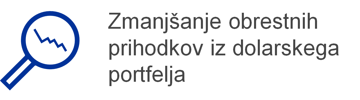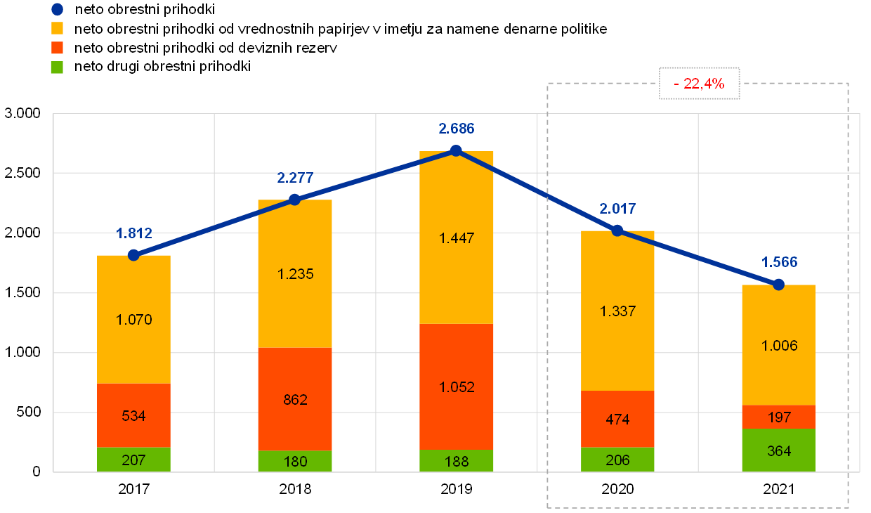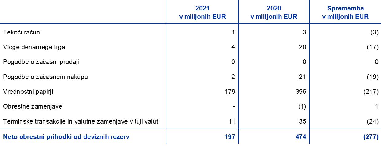 Neto obrestni prihodki od deviznih rezerv so se zmanjšali za 277 milijonov EUR na 197 milijonov EUR, in sicer predvsem zaradi nižjih obrestnih prihodkov od vrednostnih papirjev v ameriških dolarjih. Zaradi nizke donosnosti dolarskih obveznic večino leta 2020 in 2021 (graf 17) ter zaradi prodaje in unovčenja obveznic z višjo donosnostjo, kupljenih v preteklosti, se je povprečna obrestna mera v dolarskem portfelju ECB leta 2021 še dodatno znižala v primerjavi s predhodnim letom.