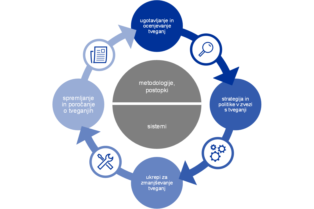 - Operativno tveganje zajema vsa nefinančna tveganja ter je opredeljeno kot tveganje negativnih posledic za poslovanje, ugled ali finančno stanje ECB zaradi ljudi, neustreznega ali neuspešnega notranjega upravljanja in poslovnih procesov, odpovedi sistemov, na katerih temeljijo procesi, ali zunanjih dogodkov (npr. naravnih nesreč ali napadov od zunaj).