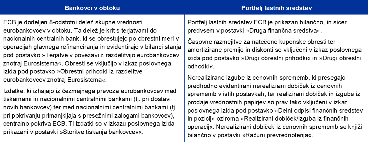 Eurosistemove operacije denarne politike se evidentirajo v računovodskih izkazih ECB in nacionalnih centralnih bank v euroobmočju, kar odraža načelo decentraliziranega izvajanja denarne politike v Eurosistemu. V tabeli 1 je pregled glavnih operacij in funkcij, ki jih ECB izvaja pri izpolnjevanju svojega mandata, skupaj z njihovim vplivom na računovodske izkaze ECB.
