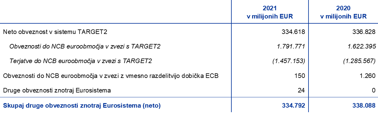 Obveznosti ECB znotraj Eurosistema, ki obsegajo predvsem neto stanje nacionalnih centralnih bank euroobmočja v sistemu TARGET2 v razmerju do ECB in obveznosti ECB v zvezi z deviznimi rezervami, ki so jih nacionalne centralne banke euroobmočja ob vstopu v Eurosistem prenesle na ECB, so se leta 2021 zmanjšale za 3,3 milijarde EUR na 375,1 milijarde EUR. Gibanje obveznosti znotraj Eurosistema v obdobju 2017–2020 je bilo predvsem posledica gibanja neto obveznosti v sistemu TARGET2 zaradi neto nakupov vrednostnih papirjev s strani ECB za namene denarne politike, ki se poravnajo prek računov v sistemu TARGET2 (graf 10).