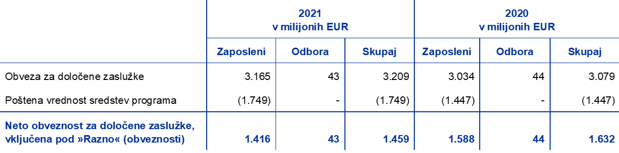 - V stebru z določenimi zaslužki so izkazani samo obvezni prispevki ECB in zaposlenih. Prostovoljni prispevki zaposlenih v steber z določenimi prispevki so v letu 2021 znašali 220 milijonov EUR (2020: 186 milijonov EUR). Ti prispevki se investirajo v sredstva programa in zaradi njih nastane obveza v enaki vrednosti.