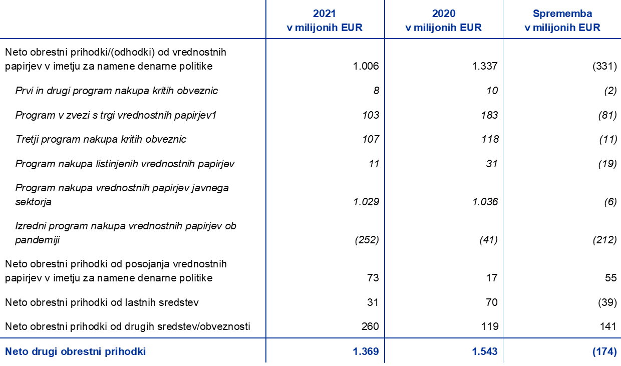 Neto obrestni prihodki od vrednostnih papirjev v imetju za namene denarne politike so se leta 2021 zmanjšali za 331 milijonov EUR na 1.006 milijonov EUR (graf 15), kar je bilo predvsem posledica negativnih neto obrestnih prihodkov od vrednostnih papirjev v portfelju izrednega programa ob pandemiji. Nadaljnje izvajanje nakupov vrednostnih papirjev javnega sektorja v okviru izrednega programa ob pandemiji – s povprečno negativno donosnostjo zaradi nizke donosnosti državnih obveznic euroobmočja med izvajanjem tega programa (graf 16) – je privedlo do povišanih negativnih neto obrestnih prihodkov iz tega portfelja v letu 2021 (252 milijonov EUR) v primerjavi z negativnimi neto obrestnimi prihodki leto prej (41 milijonov EUR). Poleg tega so se neto obrestni prihodki od vrednostnih papirjev v programu v zvezi s trgi vrednostnih papirjev ter v prvem in drugem programu nakupa kritih obveznic zmanjšali za 82 milijonov EUR na 111 milijonov EUR zaradi zmanjšanja velikosti teh portfeljev, potem ko so vrednostni papirji zapadli. Neto obrestni prihodki iz programa nakupa vrednostnih papirjev (od vrednostnih papirjev v programu nakupa listinjenih vrednostnih papirjev, tretjega programa nakupa kritih obveznic in programa nakupa vrednostnih papirjev javnega sektorja) so se zmanjšali za 37 milijonov EUR na 1.147 milijonov EUR, in sicer predvsem zaradi nižje povprečne obrestne mere pri vrednostnih papirjih v programu nakupa listinjenih vrednostnih papirjev.