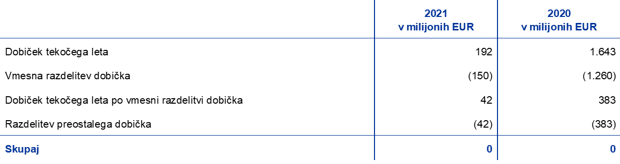 Leta 2021 je čisti dobiček ECB znašal 192 milijonov EUR. S sklepom Sveta ECB je bil z vmesno razdelitvijo dobička 31. januarja 2022 nacionalnim centralnim bankam v euroobmočju razdeljen dobiček v višini 150 milijonov EUR. Svet ECB je nadalje sklenil, da se nacionalnim centralnim bankam v euroobmočju razdeli tudi preostali dobiček v višini 42 milijonov EUR.