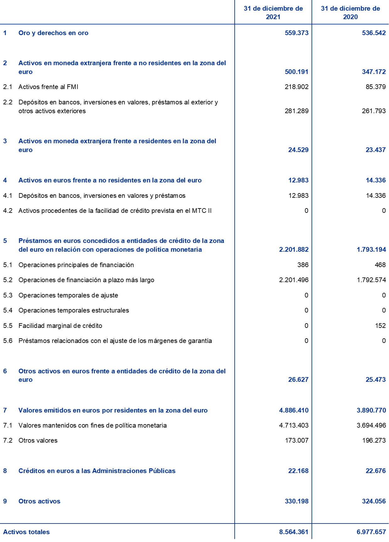 Balance consolidado del Eurosistema a 31 de diciembre de 2021