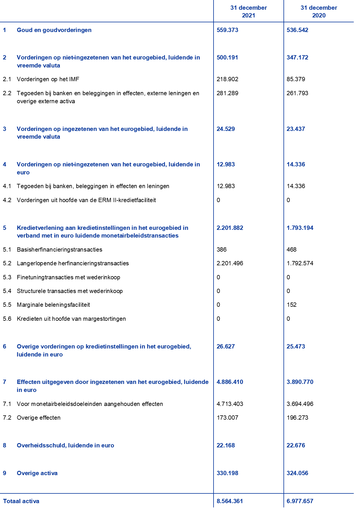 De geconsolideerde balans van het Eurosysteem per 31 december 2021