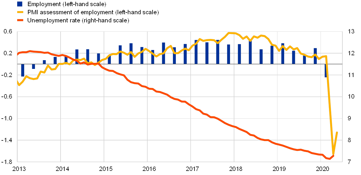 Euro area real GDP decreased by 3.8%, quarter on quarter, in the first quarter of 2020, and incoming data point to a further significant contraction of real GDP in the second quarter. The latest economic indicators and survey results confirm a sharp contraction of the euro area economy and rapidly deteriorating labour market conditions. The coronavirus pandemic and the necessary containment measures have severely affected both the manufacturing and services sectors, taking a toll on the productive capacity of the euro area economy and on domestic demand. Most recent indicators suggest some bottoming-out of the downturn in May as parts of the economy gradually reopen. Accordingly, euro area activity is expected to rebound in the third quarter as the containment measures are eased further, supported by favourable financing conditions, an expansionary fiscal stance and a resumption in global activity, although the overall speed and scale of the rebound remains highly uncertain.
