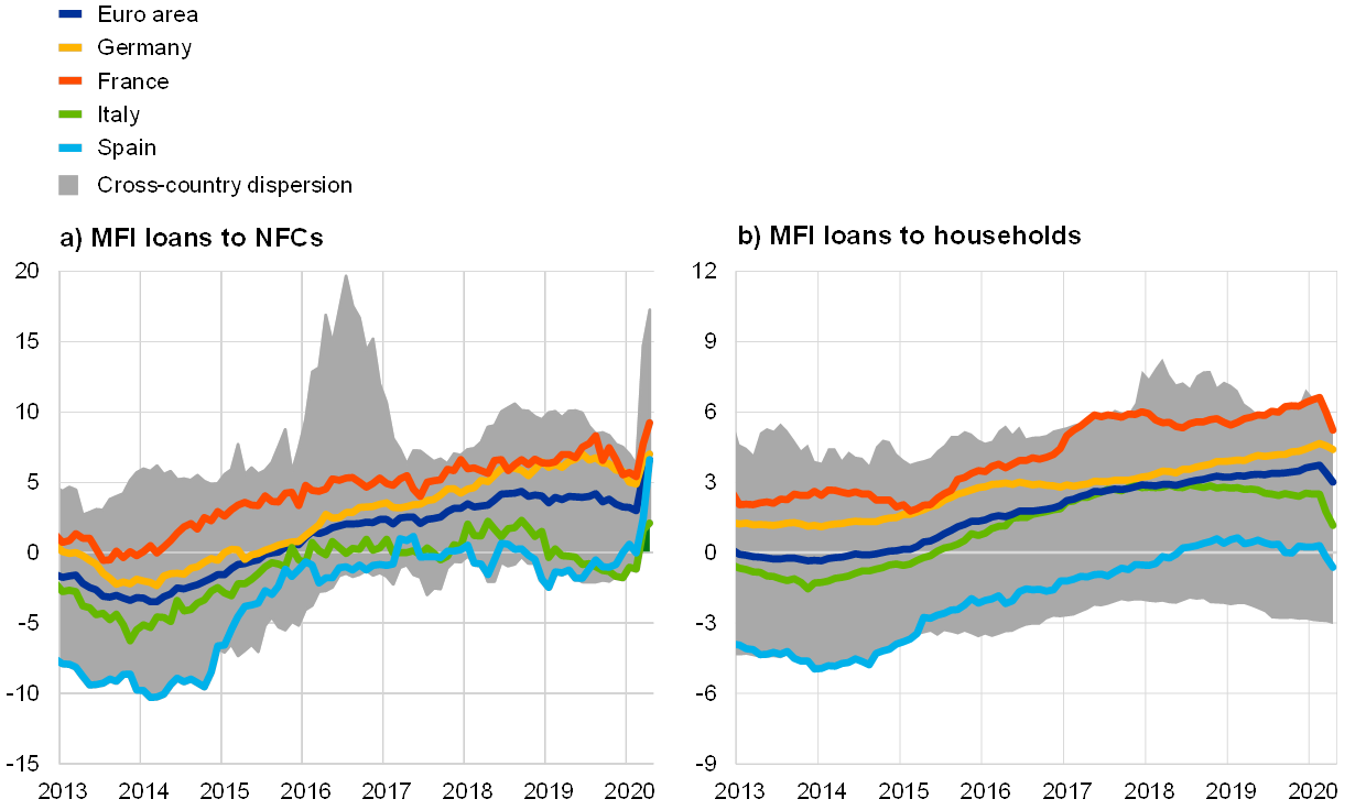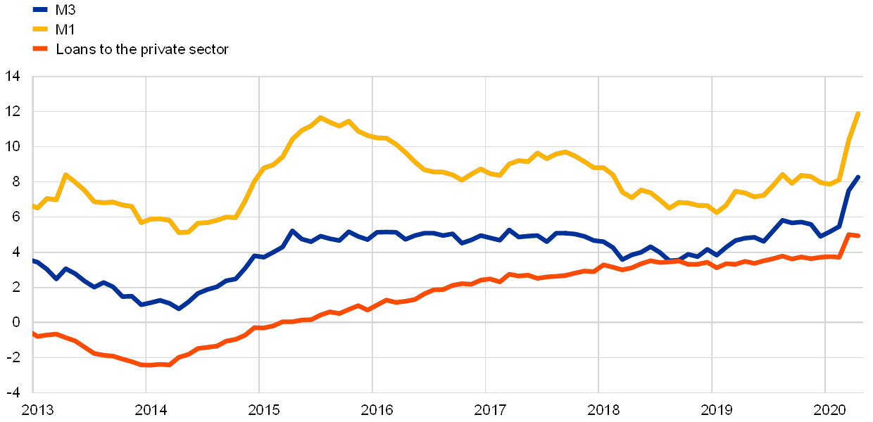 The COVID-19 pandemic caused a sharp acceleration in monetary dynamics, driven by acute liquidity needs of businesses to finance ongoing payments and strong preferences for money holdings for precautionary reasons among economic agents. Broad money (M3) growth increased to 8.3% in April 2020, from 7.5% in March. The strong money growth reflects bank credit creation, which is being driven to a large extent by the acute liquidity needs in the economy. Moreover, high economic uncertainty is triggering a shift towards money holdings for precautionary reasons. The narrow monetary aggregate M1, encompassing the most liquid forms of money, continues to be the main contributor to broad money growth. Developments in loans to the private sector continued to be shaped by the impact of the coronavirus on economic activity. The annual growth rate of loans to non-financial corporations rose further to 6.6% in April 2020, up from 5.5% in March, reflecting firms’ need to finance their ongoing expenditure and working capital in the context of rapidly declining revenues. At the same time, the annual growth rate of loans to households decreased to 3.0% in April, from 3.4% in March, amid consumption constraints due to the containment measures, declining confidence and a deteriorating labour market. The Governing Council’s policy measures, in particular the very favourable terms for the targeted longer-term refinancing operations (TLTRO III), should encourage banks to extend loans to all private sector entities. Together with the measures adopted by national governments and European institutions, the Governing Council’s measures support ongoing access to financing, including for those most affected by the ramifications of the coronavirus pandemic.