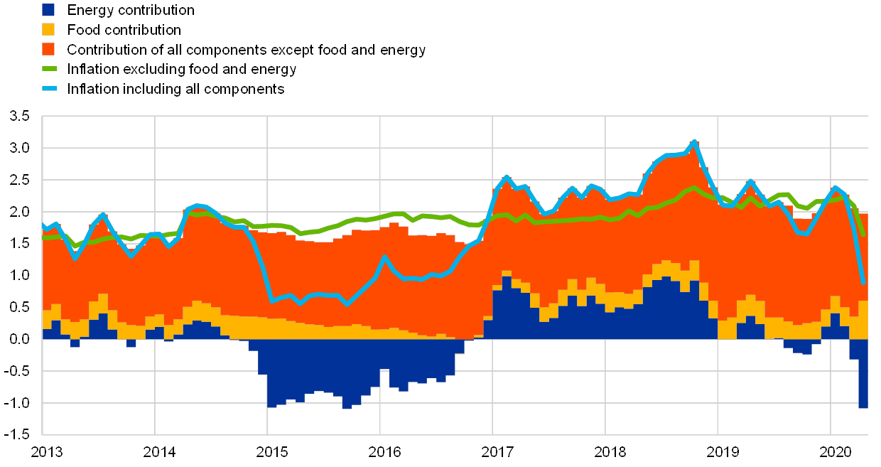 This assessment is also reflected in the June 2020 Eurosystem staff macroeconomic projections for the euro area, which foresee annual HICP inflation in the baseline scenario at 0.3% in 2020, 0.8% in 2021 and 1.3% in 2022. Compared with the March 2020 ECB staff macroeconomic projections, the outlook for HICP inflation has been revised downwards by 0.8 percentage points in 2020, 0.6 percentage points in 2021 and 0.3 percentage points in 2022. Annual HICP inflation excluding energy and food is expected to be 0.8% in 2020, 0.7% in 2021 and 0.9% in 2022.