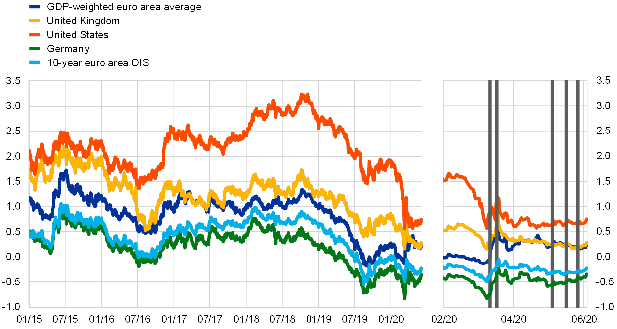 Notes: Daily data. The vertical grey lines denote (from left to right) the March Governing Council meeting (12 March 2020), the PEPP announcement (18 March 2020), the German Federal Constitutional Court ruling (5 May 2020), the Franco-German proposal for a €500 billion European recovery fund (18 May 2020) and the European Commission proposal for a €750 billion “Next Generation EU” recovery instrument (27 May 2020). The latest observations are for 3 June 2020.