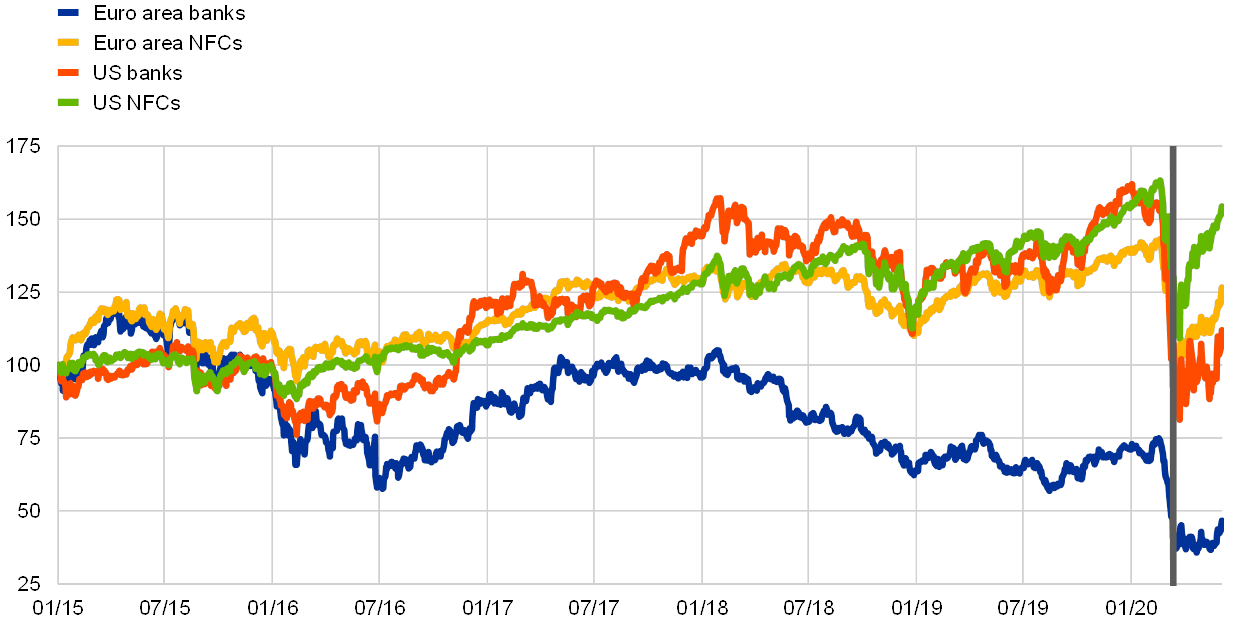 Equity price indices for euro area non-financial corporations (NFCs) increased, recouping a significant share of the losses registered in February and March (see Chart 7). Equity prices of euro area NFCs increased by 14% over the review period, supported by a recovery in risk sentiment and the perception that tail risks of an imminent global crisis have faded to some extent. The recovery in risk sentiment more than offset other factors which weighed on equity prices, such as a reduction in earnings growth expectations at all horizons.[5] Globally, the rebound was strongest for US NFCs, with equity prices increasing by 16%. By contrast, bank equity prices in the euro area decreased by 5% over the review period, while they increased by 8% in the United States.