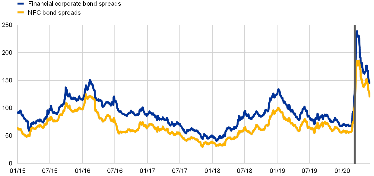 Euro area corporate bond spreads widened until mid-March but have since partly reverted following the adoption of the PEPP (see Chart 8). Spreads on investment-grade NFC bonds and financial sector bonds relative to the risk-free rate increased by 81 and 112 basis points, respectively, between the beginning of the review period and 24 March to reach an intra-period high of 185 and 239 basis points. Since then, corporate bond spreads have been slowly declining to reach 121 and 146 basis points. Overall, the widening largely reflects an increase in excess bond premia, but credit fundamentals, as measured by ratings and expected default frequencies, have also deteriorated.
