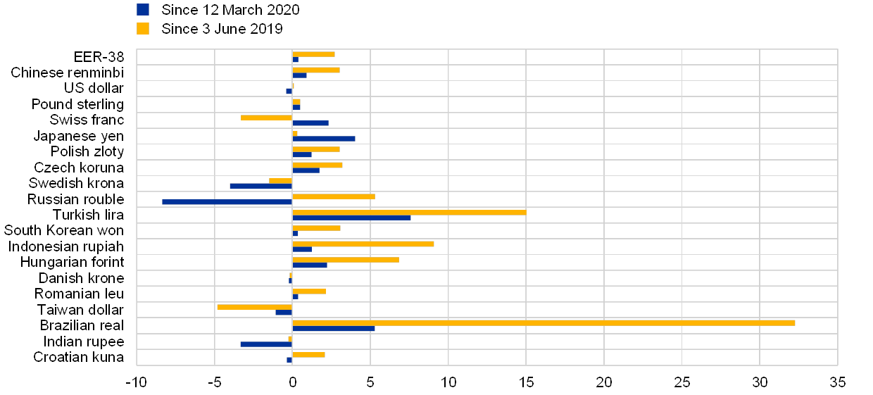 Notes: EER-38 is the nominal effective exchange rate of the euro against the currencies of 38 of the euro area’s most important trading partners. A positive (negative) change corresponds to an appreciation (depreciation) of the euro. All changes have been calculated using the foreign exchange rates prevailing on 3 June 2020.