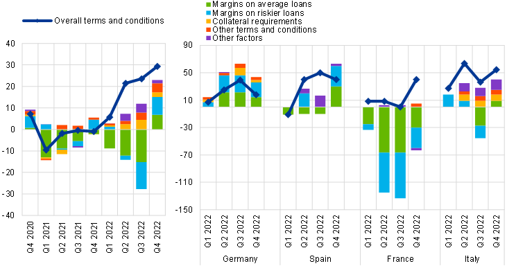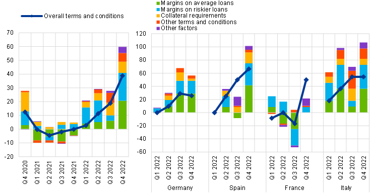 Credit standards for loans to enterprises tightened in net terms in all four largest euro area countries in the fourth quarter of 2022 (see Overview table). Credit standards for housing loans also tightened across all four largest euro area countries, while credit standards for consumer credit and other lending to households were unchanged in Italy and tightened in Germany, Spain and France.