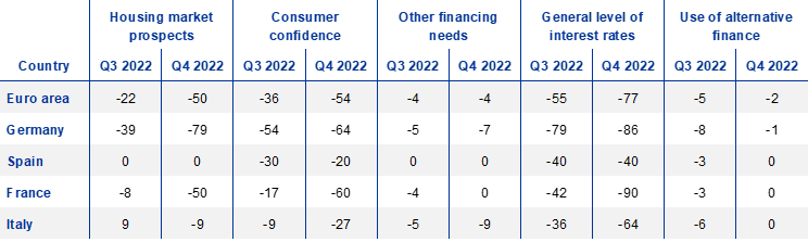 Banks reported on balance a net decrease in demand for loans to enterprises in Germany, while loan demand increased in Spain and France and was unchanged in Italy in the fourth quarter of 2022. Net demand for both housing loans and consumer credit decreased in all four largest euro area countries. In particular, banks in Germany and France reported a very large net decrease in demand for loans for house purchase (-93% and -90% respectively).
